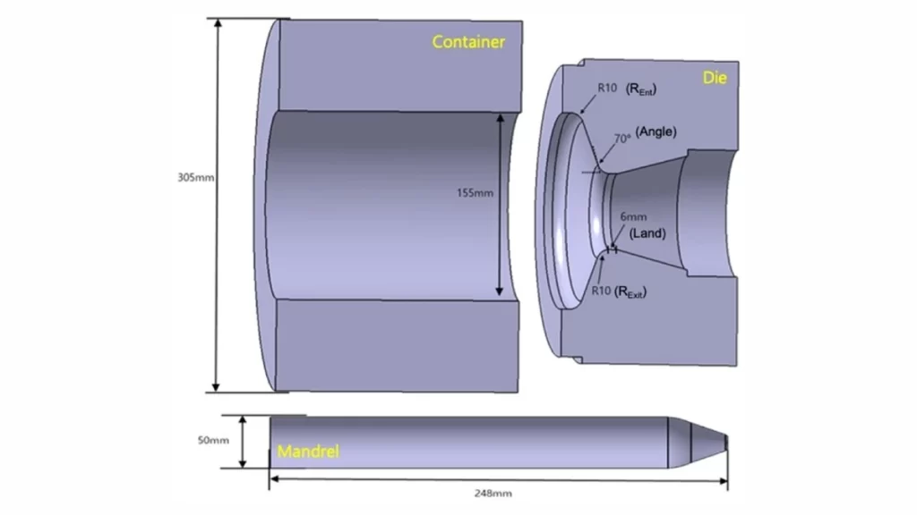Alt text: A detailed 3D illustration of the design configuration for aluminum extrusion. It highlights the strategic arrangement of containers, dies, and mandrels to optimize the extrusion process.