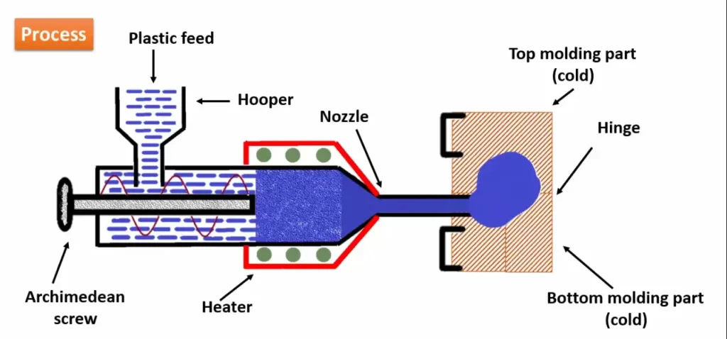 - Injection: Melted plastic is injected into the mold cavity.