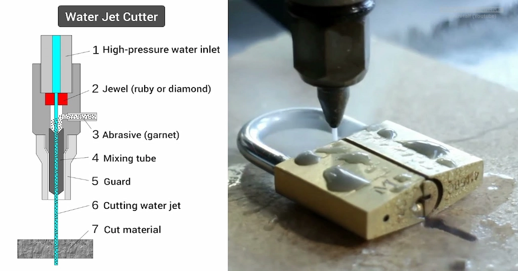 | Nozzle | Focuses the water jet or abrasive mixture to perform the actual cutting operation. |